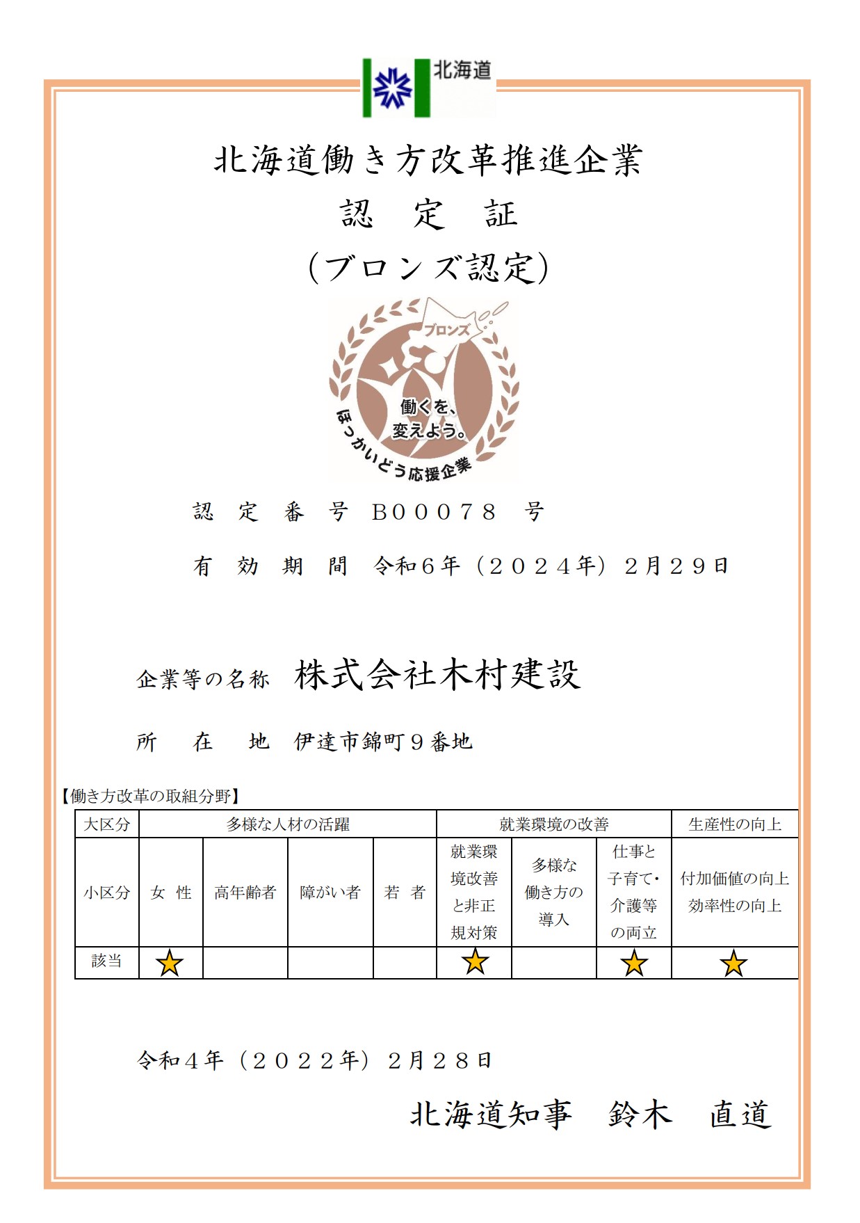 トップ コンテンツ R4北海道働き方改革推進企業認定 令和4年2月にほっかいどう応援企業【ブロンズ】 令和2年3月31日より令和4年3月31日から令和4年2月28日より令和6年2月29日へ北海道働き方改革推進企業が認定更新されました